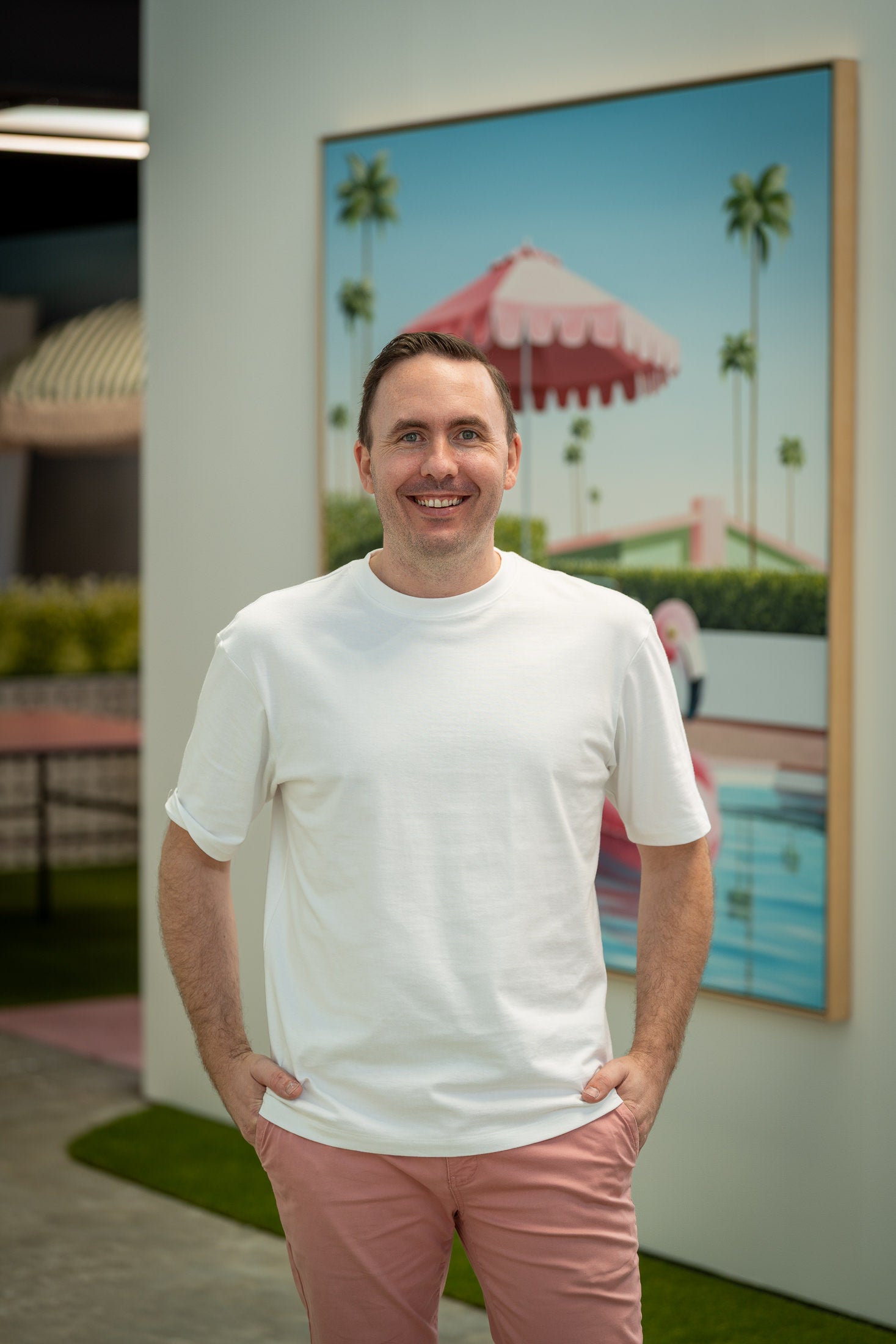 Within these environments, familiar motifs—pools, inflatables, palm trees, and classic cars—are positioned with precision. The compositions feel both recognisable and subtly unreal, capturing an atmosphere that sits between memory and imagination. While visually resolved, the work carries a quiet sense of distance, reflecting an idealised version of place rather than a direct representation of lived experience.